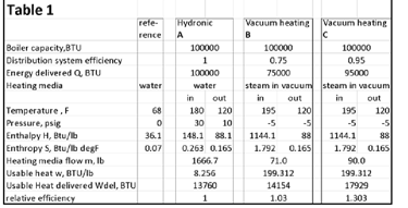 The calculated value of usable heat delivered to the radiators for an ideal hydronic system A is similar to vacuum heating system B with 25% heat loss in distribution. 30.3% higher energy efficiency can be expected from vacuum heating with upgraded piping.