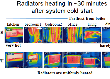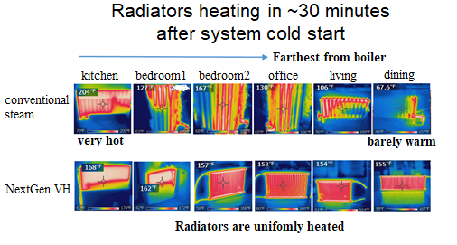 Feasibility and benefits of novel steam retrofit technology was confirmed. Energy savings up to 50% reported. Infrared picures of radiators confirm that heat is distributed much quicker and evenly - Figure 1